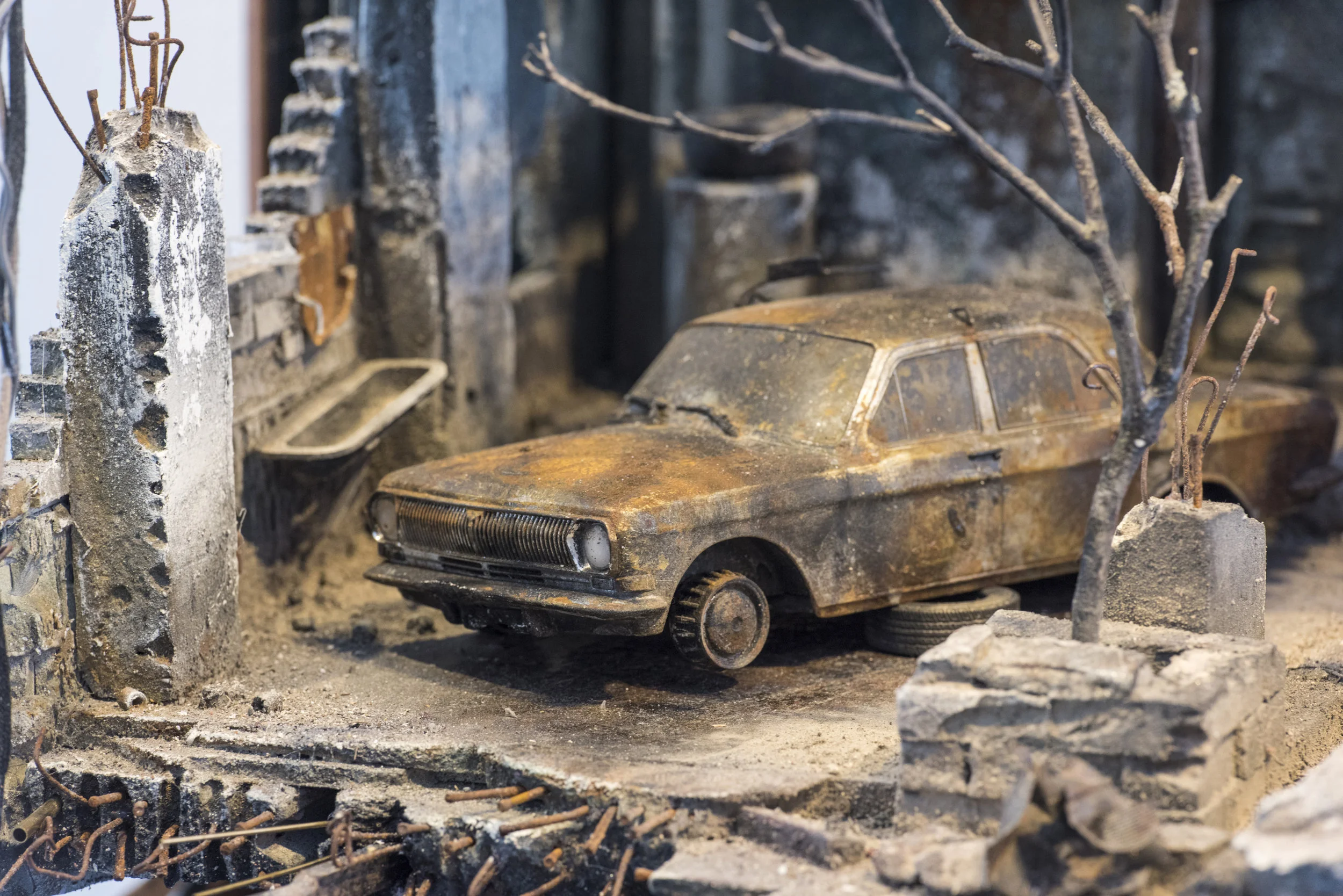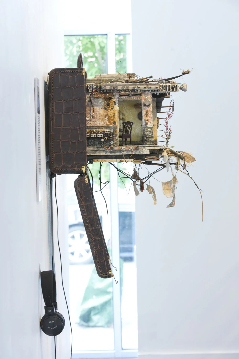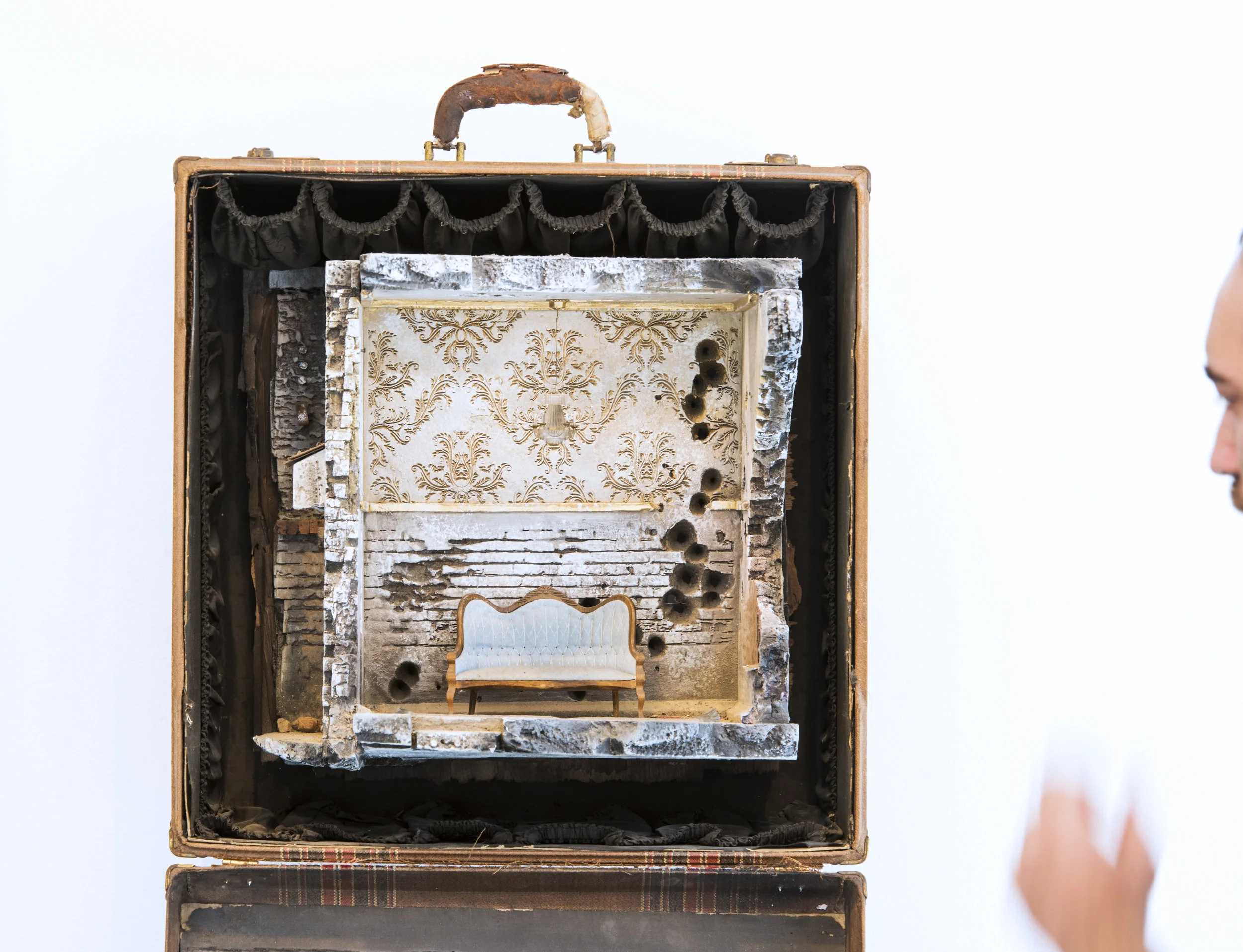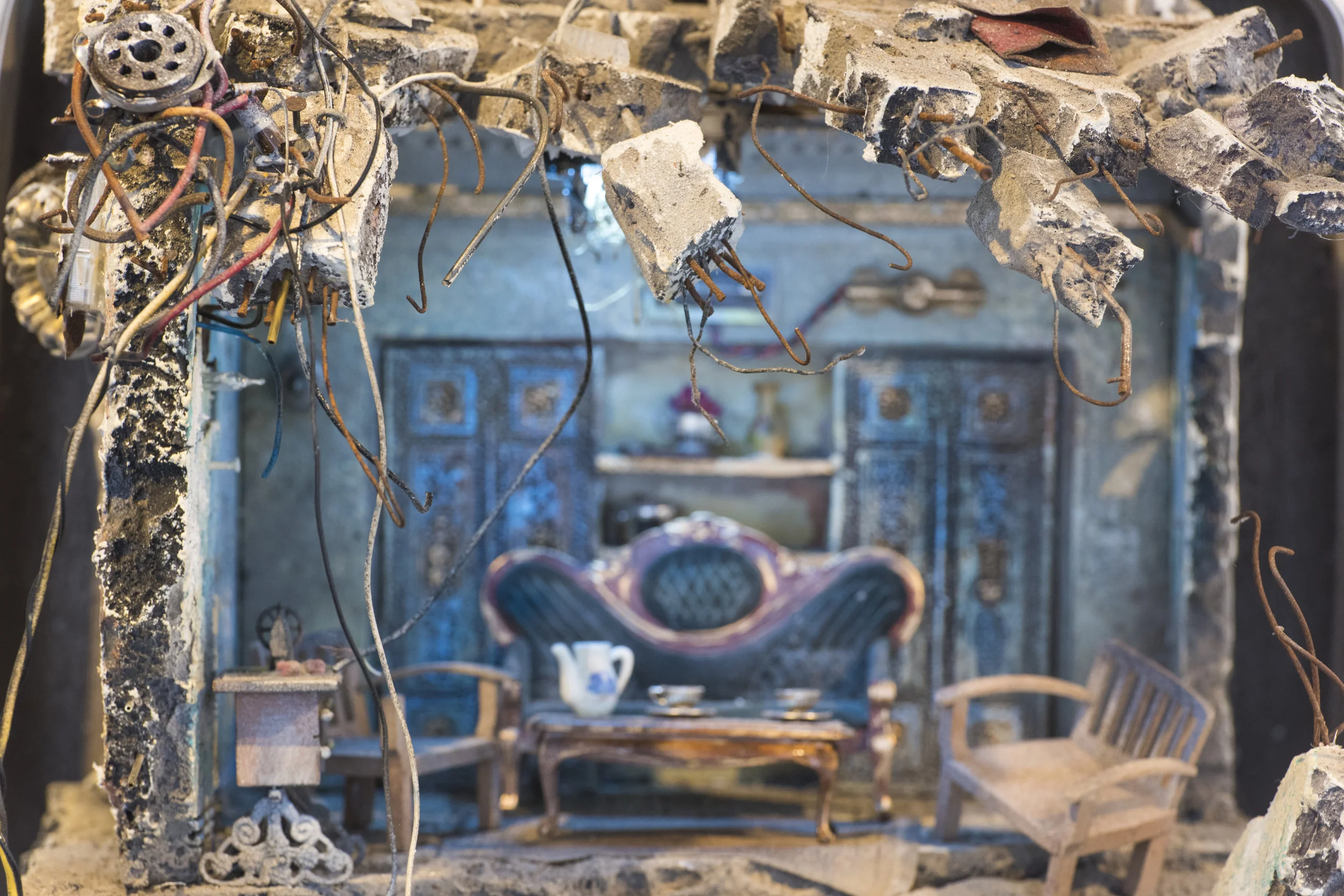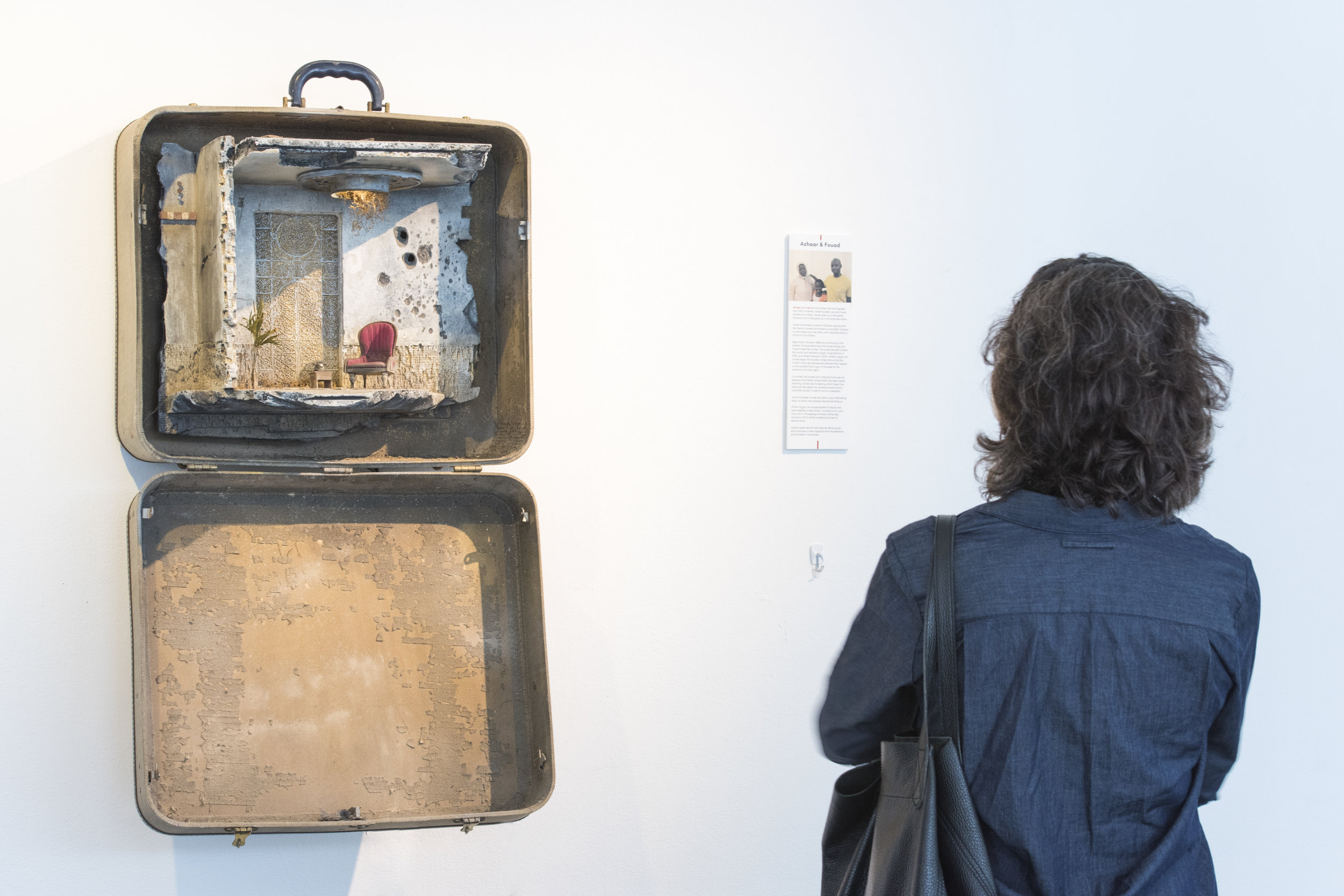 For UNPACKED: Refugee Baggage Hafez sculpturally re-creates rooms, homes, buildings and landscapes that have suffered the ravages of war. Each is embedded with the voices and stories of real people — from Afghanistan, Congo, Syria, Iraq and Sudan — who have escaped those same rooms and buildings to build a new life in America. Their stories are collected and curated by Badr, who attends Wesleyan University and is himself an Iraqi refugee. Visitors experience short audio clips through headphones and can continue reading the stories online and on exhibit placards.